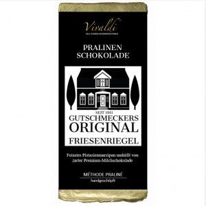 Zartschmelzender heller und dunkler Nuss-Nougat in fünf dünnen Schichten, mit Vollmilchkuvertüren angesetzt.
